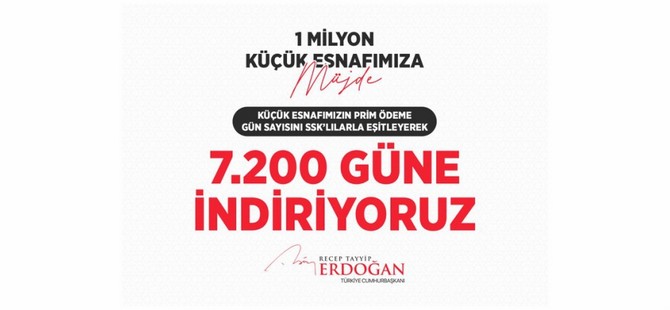 Cumhuriyet Meydanı’nda düzenlenen mitingde yaptığı konuşmada konu ile ilgili olarak şunları söyledi: "Buradan kuaför, manav, bakkal, tesisatçı küçük esnaflarımıza da bir müjde vermek istiyorum. Küçük esnaflarımızın prim ödeme gün sayısını SGK'lılarla eşitleyerek 7200 güne indiriyoruz. Yeni dönemde yapacağımız ilk işlerden biri olacak bu çalışmadan inşallah 1 milyon küçük esnafımız faydalanacak. Tüm esnaf kardeşlerimize hayırlı olsun diyorum" dedi.