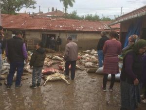 Afyonkarahisar'ın Emirdağ ilçesinde dün yağan sağanak yağmur ve dolu yaklaşık 45 dakika sürdü. Yağış sonrası ilçede birçok ev ve iş yeri su altında kalırken, bir vatandaşında ahırını su basması sonucu 67 koyun boğularak telef oldu. Yaşanan afet sonrası ilçe halkı hayvanları telef olduğu ahırdaki manzara karşısında büyük şaşkınlık yaşadı. Ahırda bulanan birçok hayvanın telef olduğu gözlenirken, canlı olarak kurtulan hayvanlar da vatandaşlarında yardımıyla ahır dışına çıkartıldı.