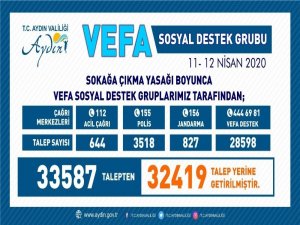 İçişleri Bakanlığı tarafından Aydın'ın da aralarında bulunduğu 30 büyükşehir ve Zonguldak'ta ilan edilen iki günlük sokağa çıkma yasağı uygulamasında vatandaşların yardımına Vefa Sosyal Destek Grubu koştu. Aydın'da vatandaşlardan gelen 33 bin 587 talepten, 32 bin 419 talep yerine getirildi. Vatandaşlar tarafından, 112 Acil Çağrı hattına 644, 155 Polis hattına 3 bin 518, 156 Jandarma hattına 827, Vefa Destek hattına 28 bin 598 talep geldi.