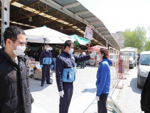 İzmir'in Bayraklı ilçesinde zabıta ekipleri, korona virüsü tedbirleri kapsamında semt pazarlarının girişlerinde vatandaşların ateşini ölçüp, eldiven ve maskesiz girişe izin vermedi.