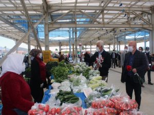 Muğla'da pazara çıkan kadınların gününü belediye başkanları müzik grubu ve karanfillerle kutladı.