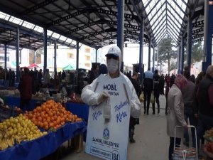 Korona Virüsden korunmak için özellikle bankalar, pazar yerleri, alış veriş merkezleri, resmi kurumlar gibi vatandaşların kalabalık ortamlarda bulaşan virüsten korumak için böyle bir uygulama başlatıldığı ifade edildi. Bir belediye görevlisi, korunaklı ve üzerinde uyarılar yazan giysileri ile çarşı pazarda dolaşıp isteyen herkese dezenfektan dağıtıyor.