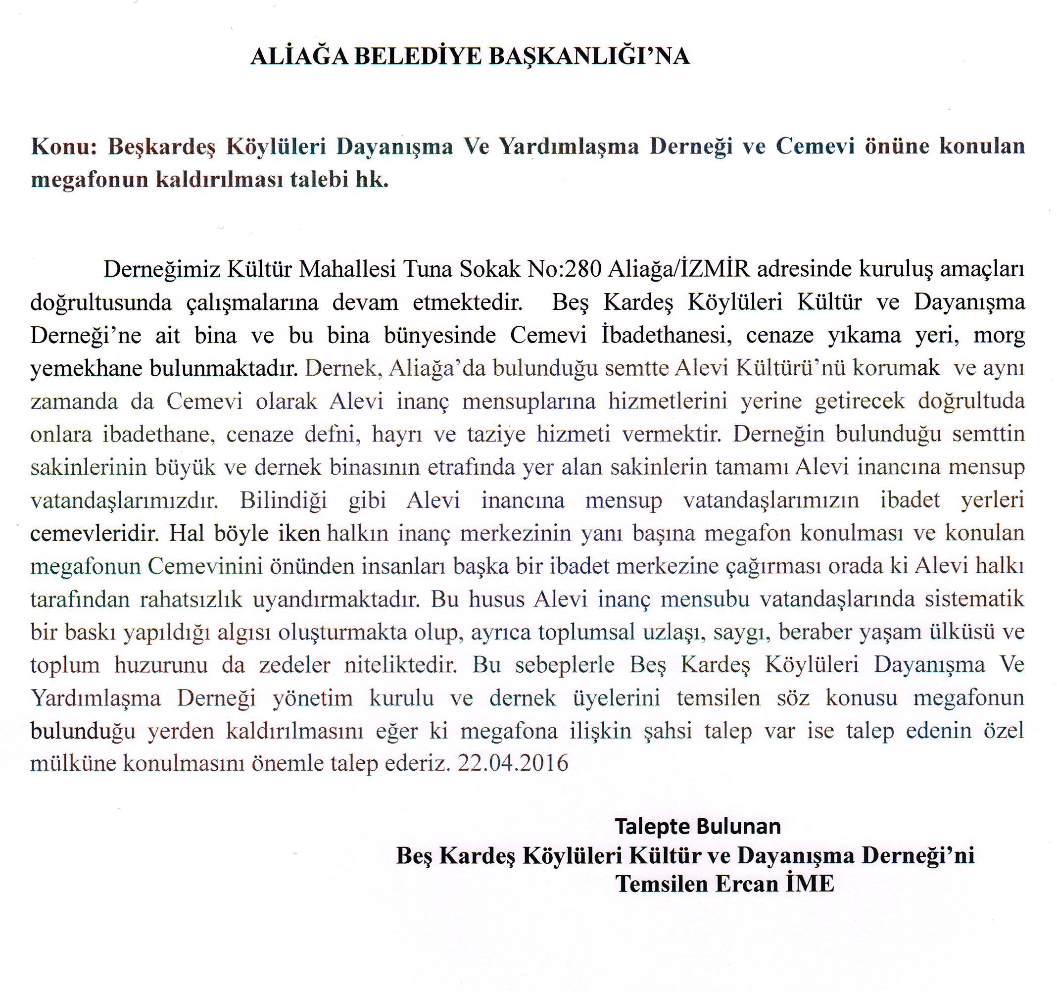 İlgili makamlara verilen dilekçede şu ifadeler yer aldı: “Bilindiği gibi Alevi İnancına mensup vatandaşlarımızın ibadet yerleri cemevleridir. Hal böyle iken halkın inanç merkezinin yanı başına megafon konulması ve konulan megafonun Cemevinin önünden İnsanları başka bir ibadet merkezine çağırması orada ki Alevi halkı tarafından rahatsızlık uyandırmaktadır. Bu husus Alevi inanç mensubu vatandaşlarında sistematik bir baskı yapıldığı algısı oluşturmakta olup, ayrıca toplumsal uzlaşı, saygı, beraber yaşam ülküsü ve toplum huzurunu da zedeler niteliktedir. Bu sebeplerle Beş Kardeş Köylüleri Kültür ve Dayanışma Derneği yönetim kurulu ve dernek üyelerini temsilen söz konusu megafonun bulunduğu yerden kaldırılmasını eğer ki megafona ilişkin şahsi talep var ise talep edenin özel mülküne konulmasını önemle talep ederiz”
