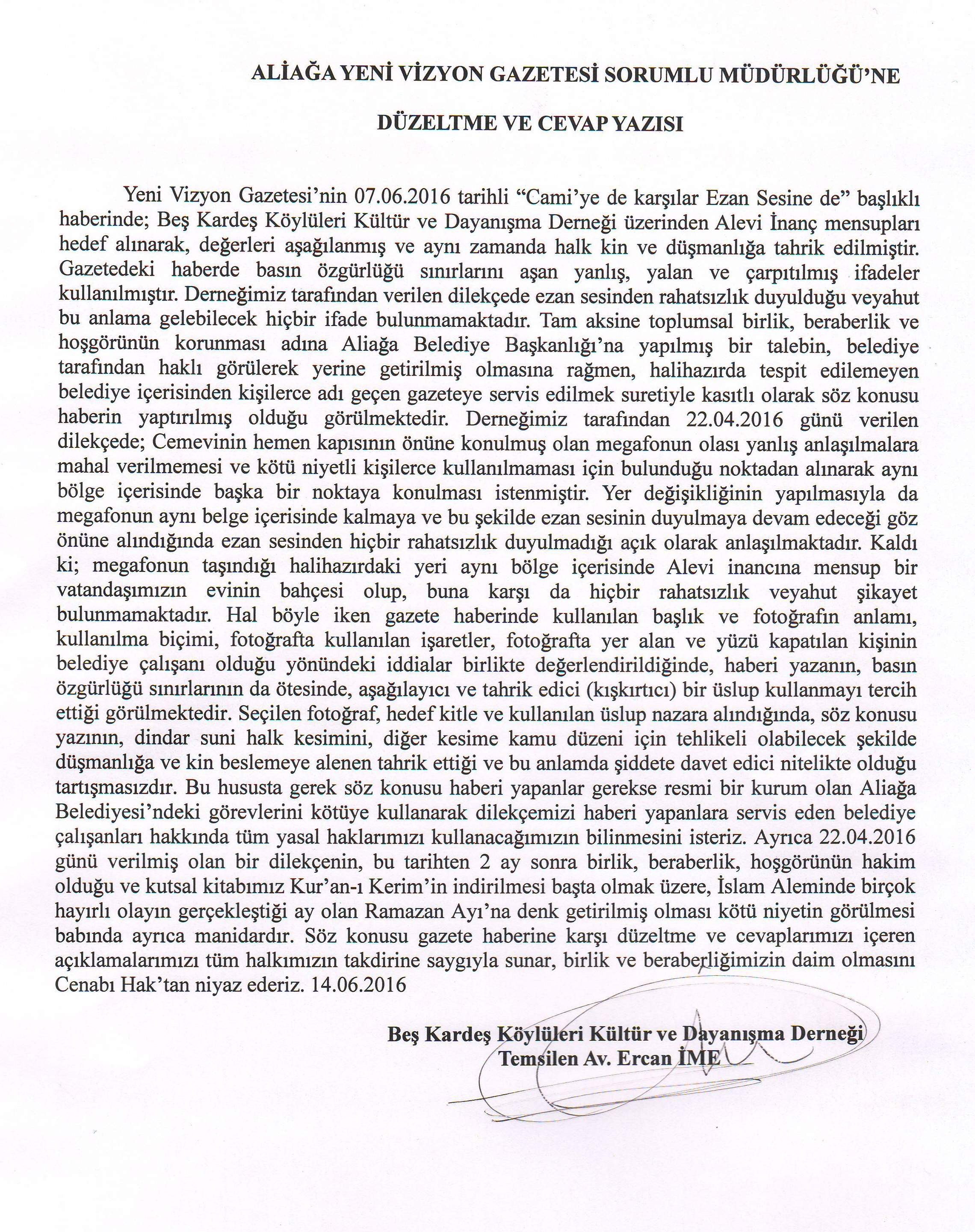 Aliağalılar cami karşıtlığının şokunu henüz atlatamamışken, yeni bir şok daha yaşadı. Aliağa’nın Kültür Mahallesi’nde faaliyet gösteren Beş Kardeş Köylüleri Kültür ve Dayanışma Derneği’nin Alevi inancına mensup üyeleri, ezan sesini duymak istemediklerini bildirdi. İbadetlerini yaptıkları cemevi’nin yakınına takılan merkezi ezan sistemi hoparlörlerinin kendi rızaları dışında kurulduğunu iddia ederek kaldırılması için ilgili makamlara dilekçeyle başvuran dernek üyeleri, Cemevi’nin bulunduğu mevkide ikamet eden mahalle sakinlerinin tamamının alevi inancına mensup olduğunu belirterek, merkezi ezan sistemi hoparlörlerinin kaldırılmasını talep etti.