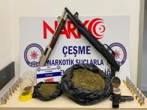 Çeşme'de Narkotik Polisleri ve Jandarma ekiplerinin bir bağ evine yaptığı ortak operasyonda, 1,5 kilo esrar maddesi, 2 tüfek, 1 tabanca ve 38 mermi ele geçirildi.