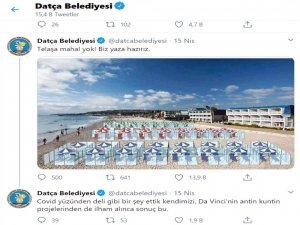 Datça Belediyesinin resmi sosyal medya hesabından yapılan paylaşımda, "Covid-19 yüzünden deli gibi bir şey ettik kendimizi, Da Vinci'nin antin kuntin projelerinden de ilham alınca sonuç bu" mesajı ile yayınlanan görselde, sanal ortamda Datça plajına yerleştirilen izolasyonlu cam kabinler dikkat çekti.
