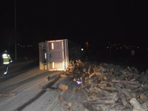 Kütahya'nın Tavşanlı ilçesinde, odun yüklü kamyon devrildi. Sürücü trafik kazasından yara almadan kurtuldu.