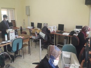 Kütahya'nın Dumlupınar ilçesinde gönüllü bayanlar tarafından Halk Eğitim Merkezi Müdürülüğü binasında maske üretimi yapıldığı bildirildi.