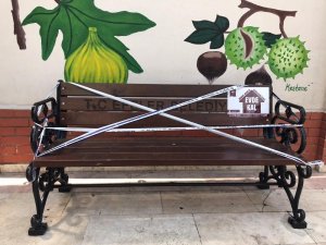 AYDIN (İHA) – Aydın'ın Efeler ilçesinde, belediye ekipleri bankların kullanımına engel olmak için şerit çekti ve uyarı notları yerleştirerek "Evde Kal" çağrısında bulundu.