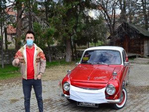 Kütahya'nın Emet ilçesinde düğünlerde ve davetlerde sahne alan yerel sanatçı Muammer Akyol'un 1972 model Anadolu marka otomobiline ve kendisine koruyucu maske takarak çektiği fotoğraf sosyal medyada büyük ilgi gördü.
