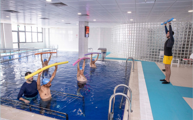 Fizik Tedavi ve Rehabilitasyon Merkezi içerisinde bulunan havuzda hastalara uygulamalı olarak tedavi yapan fizyoterapist Mehmet Mertkayış, “Buradaki uygulamamız suyun kaldırma kuvvetiyle birlikte eklemlere binen yükü azaltıp kas kuvvetini arttırmak. Aynı zamanda suyun ısı ve hidromasaj etkisi ile birlikte ağrıları azaltmak ve kasları doğrudan gevşetmek. Amacımız hastalarımızın sadece fiziki anlamda değil mental anlamda da yaşam kalitelerini arttırmak. Hastalarımızla yeri geldiğinde grup olarak yeri geldiğinde birebir çalışıyoruz” dedi.