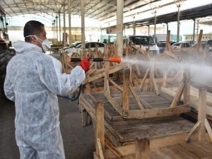Belediye Başkanı Aytekin Kaya'nın talimatıyla harekete geçen ekipler son olarak Cuma günleri kurulan kapalı pazar yerinde salgını önlemek için ilaçlama çalışması yaptı.