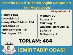 İzmir Tabip Odası tarafından yapılan bilgilendirmede, İzmir'de bu zamana kadar korona virüse yakalanan sağlıkçıların güncel sayısı açıkladı. Buna göre, 152 hekim, iki diş hekimi, hemşire-ebe-sağlık memuru alanında 154 kişi, 16 tıbbi sekreter, 88 personel, 26 teknisyen, 30 memur, altı eczacı, iki psikolog, beş güvenlik görevlisi, bir şoför ve iki mühendis olmak üzere toplam 484 sağlık çalışanının korona virüs testi pozitif çıktı.