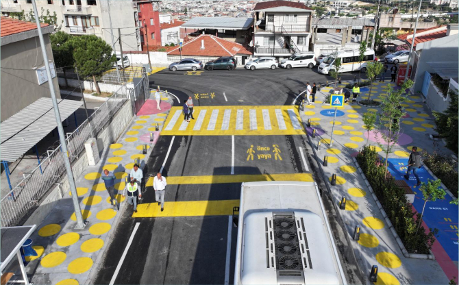 İlk olarak “Güvenli Okul Çevreleri” teması kapsamında, Karabağlar’da Cevdet Güçlüer İlkokulu ve Yunus Emre Ortaokulu çevresinde Güvenli Yaya Ulaşımı ve Oyun Sokağı Projesi uygulandı. Proje kapsamında, güvenli okul çevresi oluşturuldu ve 4238 sokak yayalaştırılarak oyun sokağına dönüştürüldü. 4237 ve 4239 sokaklar tek yöne çevrilerek okul çıkışları rahatlatıldı ve trafik yavaşlatıldı. Sırrı Atalay Caddesi’ndeki okul ana giriş aksı yaya alanı genişletildi. Sabit bekleyen manav kamyonu gibi büyük taşıtlar kaldırıldı. Okul çevresi boyunca yapılan delinatör ve peyzaj çalışmalarıyla araç parklanması önlendi. Peyzaj ve oturma birimleriyle kamusal kullanım artırıldı.