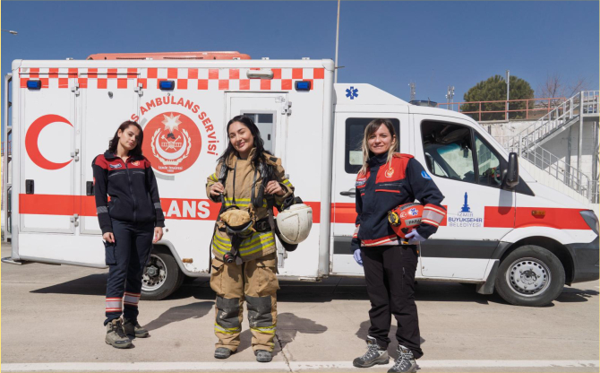 İzmir Büyükşehir Belediyesi İtfaiye Dairesi Başkanlığı bünyesinde çalışan kadınlar, tüm zorlu görevlerin üstesinden başarı ile geliyor. Başarılarıyla ilham veren kadınlardan 23 yaşındaki Ayet Kütüktaş, 15 tonluk arazöz kullanıyor. Okul öncesi öğretmeniyken baba mesleği itfaiyeciliği tercih eden Hacer Akkuş ise 4 yıldır sahada ter döküyor. Sağlık personeli Aslısüsen Oskay da yaralananlara ilk müdahaleyi yaparak şifa dağıtıyor.