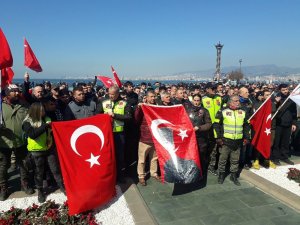 Cumhuriyet Meydanı'nda toplanan motosikletli kuryeler, saygı duruşu ve İstiklal Marşı'nın okunmasının ardından basın açıklaması düzenledi. Grup adına açıklama yapan İzmir Motosikletli Kuryeler Derneği Başkanı Burhan Akgül, "36 gencecik beden. Anaların vurmaya kıyamadığı, el bebek büyüttükleri aslan parçaları. Bugün onlar için burada toplanmış bulunuyoruz. Gazi Mustafa Kemal Atatürk, 1 subayımız şehit oldu diye hiç düşünmeden "Menemen'i yakın" diyor. Gel Paşam, Samsun'dan çık, yine gel. Çaresiziz. Gel sarı saçlım, mavi gözlüm. Bir daha gel. Dün nasıl Çanakkale yoklukla kazanılmışsa bugün Türkiye yine her şeyin üstesinden gelir. Giden canların hesabını istiyoruz. Bir vatan evladının tırnağını değişmeyiz bu hainlere. Şehit ailelerine Rabbim sabırlar versin. Allah mekanlarını cennet eylesin. İdlib'deki kardeşlerimizin de Allah yardımcıları olsun. Onlara iman gücü versin. Bizler İzmirli motosikletli kuryeler olarak savaşta olan tüm Türk Silahlı Kuvvetleri mensubumuzun yanında olduğumuzu belirtmek isteriz. Allah yüce ordumuzu muzaffer eylesin" dedi.