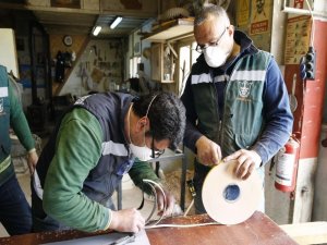 İzmir'de, Konak Belediyesinin Kadifekale'deki park ve bahçeler müdürlüğü atölyelerinde, yüz koruyucu siperlik üretimi başladı.
