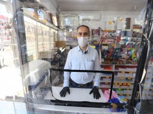 İzmir'de kırtasiyecilik yapan Murat Kengeç, korona virüs salgınına karşı işyerinin içine antre yaparak müşterilere steril bir alan oluşturdu.
