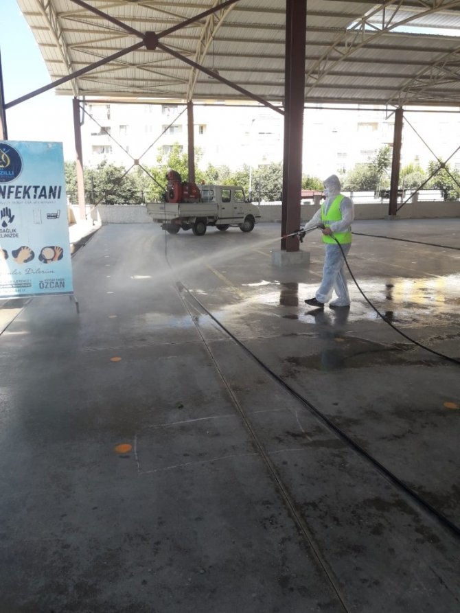Nazilli Belediyesi Sağlık İşleri Müdürlüğü ekipleri, ibadete açılan kapalı pazar alanlarını Cuma namazı öncesi dezenfekte etti.