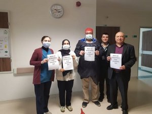 Başhekim Çağlar'ın konuşmasından sonra, sağlık çalışanları ellerindeki "Biz de sizi alkışlıyoruz evde kaldığınız için" yazılı pankartlarıyla hatıra fotoğrafı çektirdiler.