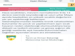 Meteoroloji Genel Müdürlüğü 15.05.2020 ile 19.05.2020 tarihleri arasında sıcaklıkların 9-13 derece yükseleceği tahmininde bulunarak turuncu uyarıda bulundu. Uzun yıllar mayıs ayında bu yükseklikte bir sıcaklığın kaydedilmediğini belirten açıklamada vatandaşların, özellikle yaşlıların, çocukların ve kronik rahatsızlığı olan vatandaşların güneş açısının dik geldiği saatlerde dışarı çıkılmaması yönünde uyardı.