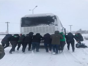 Konyaspor-Denizlispor maçına giden "Yeşil Cephe" taraftar grubunu taşıyan otobüs, yoğun kar nedeniyle Alaşehir'de yolda kaldı. Taraftarlar maça yetişmek için otobüsü girdiği kar birikintisinden ittirerek çıkardı.