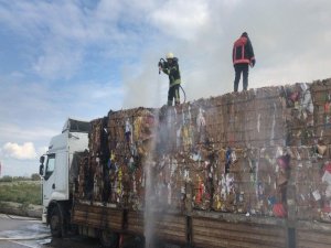 Manisa'da seyir halindeki tırın dorsesinde bulunan geri dönüşüm malzemeleri alev aldı. Kısa süreli trafiğin durdurulduğu yolda tıra müdahale eden itfaiye ekipleri, çıkan yangını kısa sürede söndürdü.