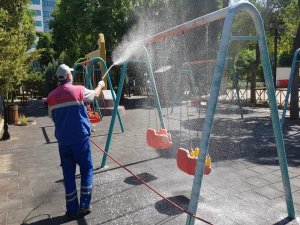 Temizlik İşleri Müdürlüğü ekipleri tarafından yapılan dezenfekte çalışmaları ile çocuk oyun alanlarında bulunan kaydırak, salıncak, tahterevalli gibi oyuncaklar ile banklar ve oyun alanlarının çevresi titizlikle dezenfekte edildi.
