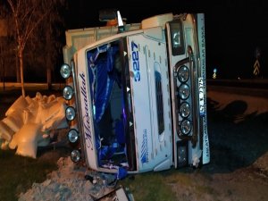 Afyonkarahisar'ın Bolvadin ilçesinde un yüklü tırın devrilmesi sonucu meydana gelen kaza hasarla atlatıldı.