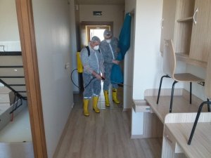 Çin'in Wuhan kentinde görülerek hızla yayılan korona virüs (Kovid19) ve diğer solunum virüslerinin neden olduğu solunum yolu hastalığından koruma ve kontrol önlemlerinin alınması için Sağlık Bakanlığı koordinesinde yurt genelinde olduğu gibi Uşak'ta da gerekli çalışmalar yürütülüyor. Bu kapsamda üniversitelerin örgün eğitime ara verdiği süre boyunca yurtlarda barınmaya devam edecek öğrenciler için Uşak Kız Yurdu, Uşak Erkek Yurdu, Latife Hanım Kız Yurdu ve Mehmet Hacım Erkek Yurdunda dezenfekte çalışması yapıldı.
