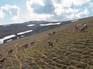 Afyonkarahisar'ın Emirdağ ilçesinde bulunan 2 bin 300 rakımlı Yellibel Yaylası'nda yaşayan onlanca yılkı atı, görüntülendi. Kendilerini görüntüleyen drone kamerayı fark eden yılkı atları, toplu halde koşturmaya başlayınca ortaya kendini hayran bırakan görüntüler çıktı.