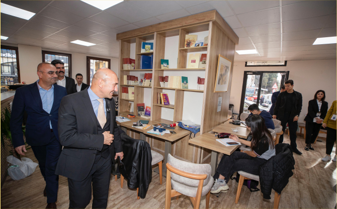 İzmir Büyükşehir Belediye Başkanı Tunç Soyer, İzmir Büyükşehir Belediyesi tarafından Buca’da açılan 100. Yıl Kitap Kafe ve Kütüphane’yi ziyaret etti.